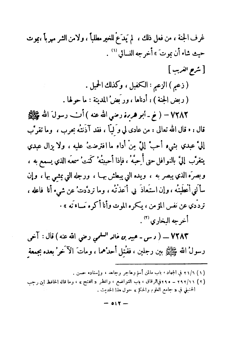 7282 - (خ) أبو هريرة - رضي الله عنه - أن رسولَ الله - صلى الله عليه وسلم- قال: «قال الله تعالى: من عادى لي وَلِيّاً، فقد آذَنتُه بحرب، وما تقرَّب إليَّ عبدي بشيء أحبَّ إليَّ مِنْ أداءِ ما افترضتُ عليه، ولا يزال عبدي يتقرَّب إليَّ بالنوافل حتى أُحِبَّهُ، فإذا أحببتُهُ كُنتُ سمعَه الذي يسمع به، وبصرَه الذي يبصر به، ويده التي يبطش بها، ورجله التي يمشي بها، وإن سألَني أعْطَيتُه، وإن استَعَاذَ بي أعَذْتُه، وما تردَّدتُ عن شيء أنا فاعله، تردّدي عن نفس المؤمن، يكره الموت وأنا أكره مَساءَتَه» . أخرجه البخاري (¬1) .