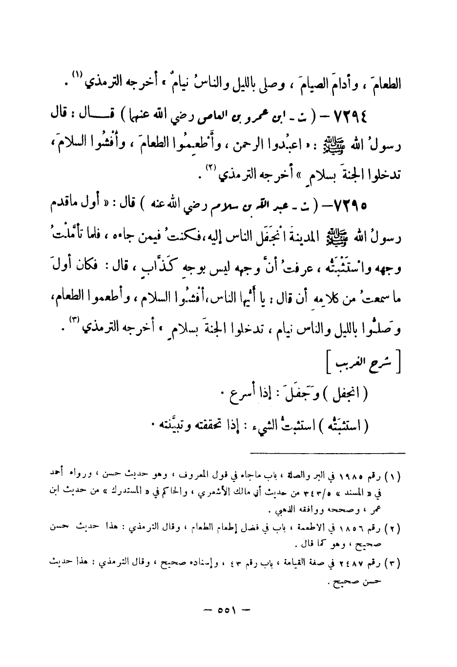 7295 - (ت) عبد الله بن سلام - رضي الله عنه - قال: «أول ما قدم رسولُ الله - صلى الله عليه وسلم- المدينةَ انْجَفَل الناس إليه، فكنتُ فيمن جاءه، فلما تأمَّلْتُ وجهه واسْتَثْبَتُّه، عرفتُ أنَّ وجهه ليس بوجهِ كَذَّاب، قال: فكان أولَ ما سمعتُ من كلامِهِ أن قال: يا أيُّها الناس، أفْشُوا السلام، وأطعموا الطعام، وصَلُّوا بالليل والناس نيام، تدخلوا الجنةَ بسلام» أخرجه الترمذي (¬1) .