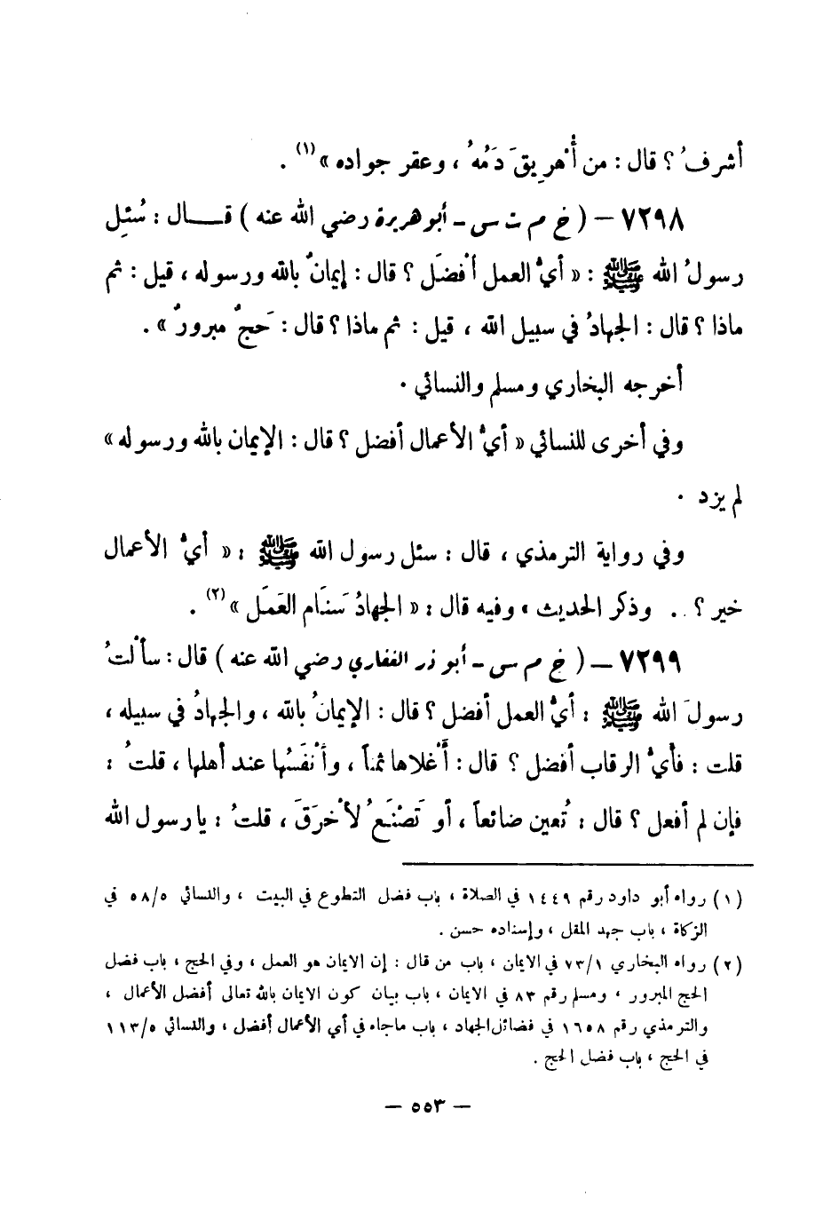 7298 - (خ م ت س) أبو هريرة - رضي الله عنه - قال: سُئِل رسولُ الله - صلى الله عليه وسلم-: «أيُّ العمل أفْضَل؟ قال: إيمان بالله ورسوله، قيل: ثم ماذا؟ قال: الجهادُ في سبيل الله، قيل: ثم ماذا؟ قال: حَجّ مبرور» . أخرجه البخاري ومسلم والنسائي.