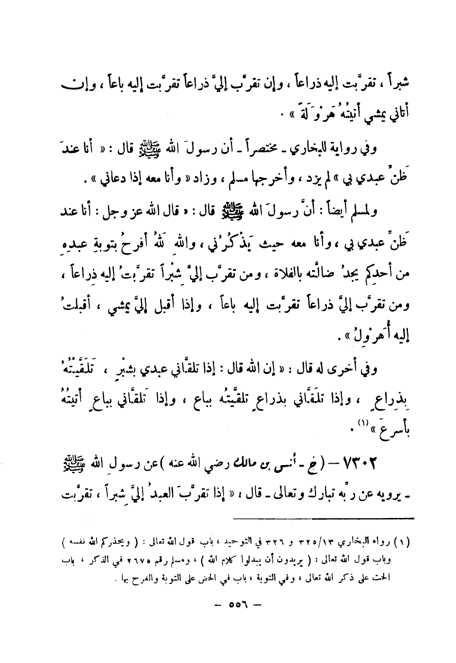 7302 - (خ) أنس بن مالك - رضي الله عنه - عن رسولِ الله - صلى الله عليه وسلم- يرويه عن ربِّه تبارك وتعالى - قال: «إذا تقرَّبَ العبدُ إليَّ شِبراً، تقرَّبت -[557]- إليه ذِراعاً، وإذا تقرَّب إليَّ ذِراعاً، تقرَّبتُ منه باعاً، وإذا أتاني يمشي، أتيتُهُ هَرْوَلَة» أخرجه البخاري (¬1) .