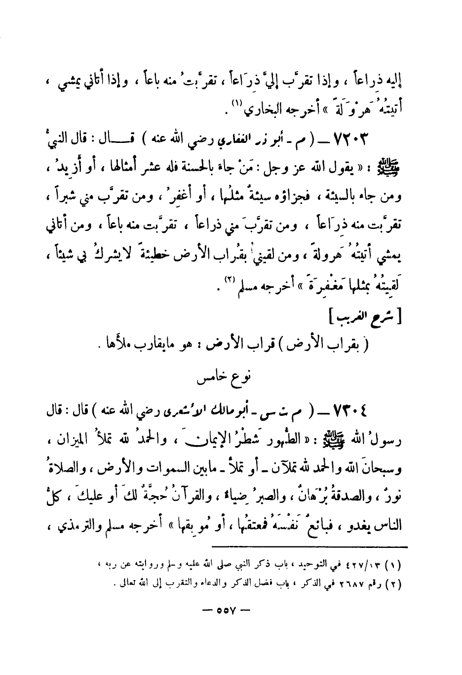 7303 - (م) أبو ذر الغفاري - رضي الله عنه - قال: قال النبي - صلى الله عليه وسلم-: «يقول الله عز وجل: مَنْ جاءَ بالحسنة فله عشر أمثالها، أو أزيدُ، ومن جاء بالسيئة، فجزاؤه سيئة مثلُها، أو أغْفِر، ومن تقرَّب مني شبراً، تقرَّبت منه ذِرَاعاً، ومن تقرَّب مني ذراعاً، تقرَّبت منه باعاً، ومن أتاني يمشي أتيتُه هَرولة، ومن لقيني بقُراب الأرض خطيئة لا يشركُ بي شيئا، لَقِيتُهُ بمثلها مَغْفِرة» أخرجه مسلم (¬1) .