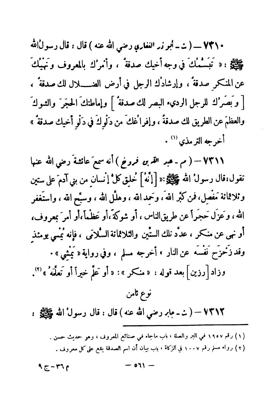 7310 - (ت) أبو ذر الغفاري - رضي الله عنه - قال: قال رسولُ الله - صلى الله عليه وسلم-: «تَبَسُّمُكَ في وجه أخيك صدقة، وأمْرُك بالمعروف ونَهْيُكَ عن المنكَرِ صدقة، وإرشادُك الرجل في أرض الضلال، لك صدقة، [وبَصَرُك للرجل الرديء البصر، لك صدقة] وإماطتكَ الحجَرَ والشوكَ والعظمَ عن الطريق، لك صدقة، وإفراغُكَ من دَلْوِكَ في دَلْوِ أخيك صدقة» . أخرجه الترمذي (¬1) .