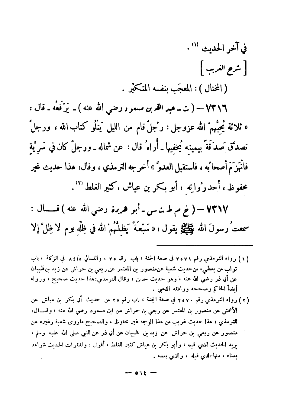 7316 - (ت) عبد الله بن مسعود - رضي الله عنه - يَرْفَعُه - قال: «ثلاثة يُحِبُّهمُ الله عز وجل: رجُل قام من الليل يَتْلُو كتاب الله، ورجل تصدَّق صَدَقَة بيمينِه يُخفِيها - أُراهُ قال: عن شماله - ورجل كان في سَرِيَّة فانْهَزَمَ أصحابُه، فاستقبل العدوَّ» أخرجه الترمذي، وقال: هذا حديث غير محفوظ، أحد رُواتِهِ: أبو بكر بن عياش، كثير الغلط (¬1) .