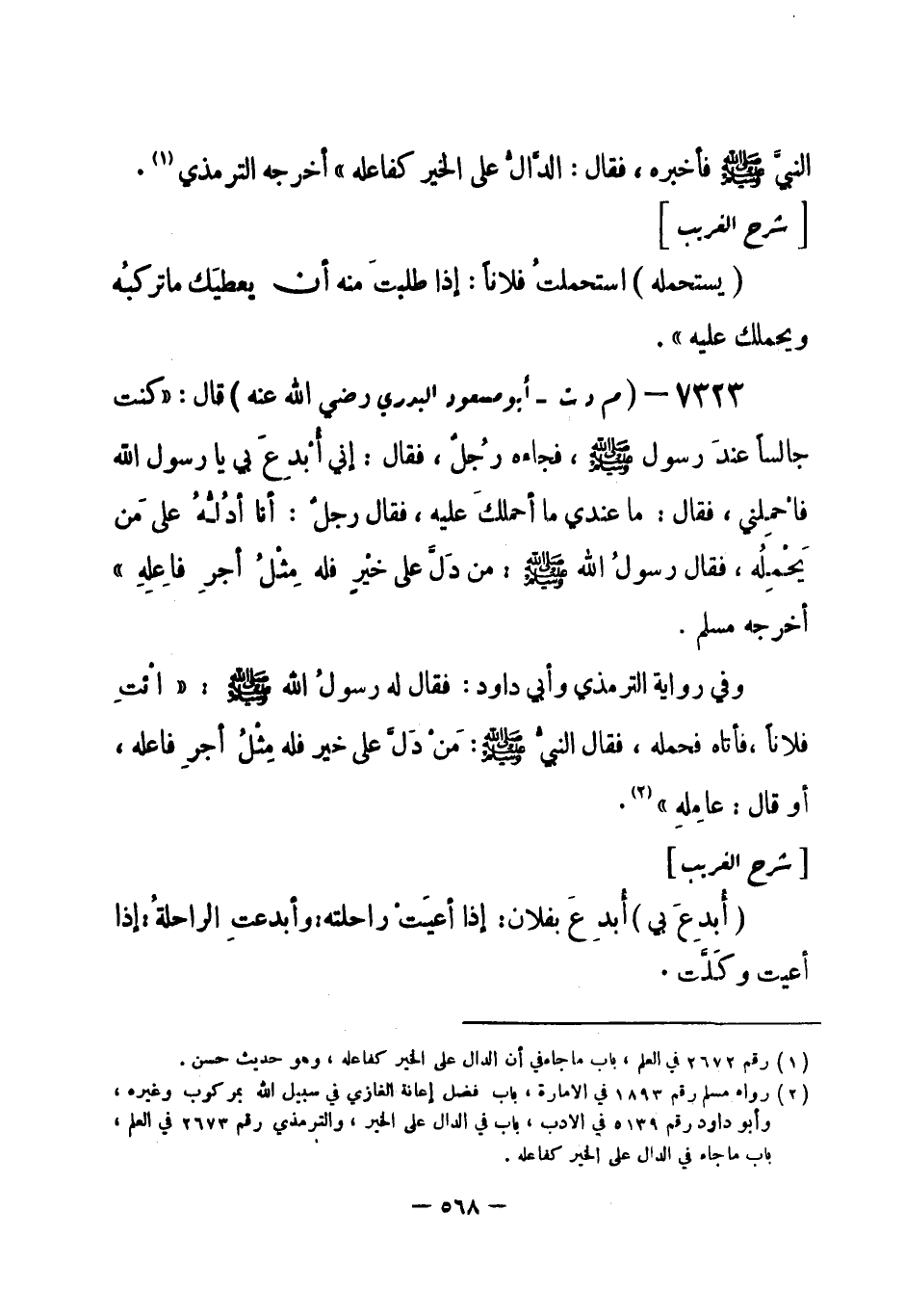 7323 - (م د ت) أبو مسعود البدري - رضي الله عنه - قال: «كنت جالساً عندَ رسولِ الله - صلى الله عليه وسلم-، فجاءه رجُل، فقال: إني أُبْدِعَ بي يا رسولَ الله، فاحْمِلْني، فقال: ما عندي ما أحملكَ عليه، فقال رجل: أنا أدُلُّهُ على مَن يَحْمِلُه، فقال رسولُ الله - صلى الله عليه وسلم-: «من دَلَّ على خيْر فله مِثْلُ أجرِ فاعِلِه» أخرجه مسلم.
