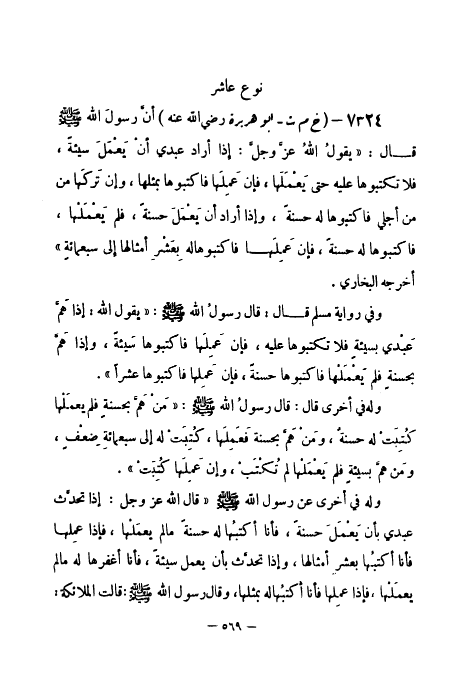 7324 - (خ م ت) أبو هريرة - رضي الله عنه - أن رسولَ الله - صلى الله عليه وسلم- قال: «يقولُ الله عزَّ وجلَّ: إذا أراد عبدي أنْ يَعْمَلَ سيئة، فلا تكتبوها عليه حتى يَعْمَلَها، فإن عَمِلَها فاكتبوها بمثلها، وإن تَركَها من أجلي فاكتبوها له حسنة، وإذا أراد أن يَعْمَلَ حسنة، فلم يَعْمَلْها، فاكتبوها له حسنة، فإن عملها فاكتبوها بِعَشْرِ أمثالها إلى سبعمائة» أخرجه البخاري.