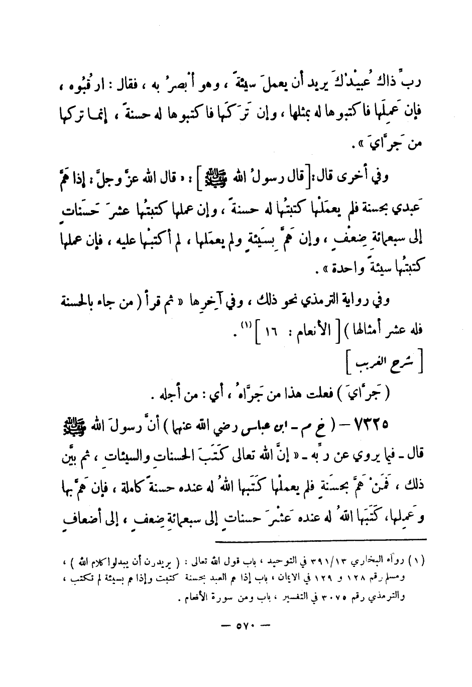 7325 - (خ م) ابن عباس - رضي الله عنهما - أن رسولَ الله - صلى الله عليه وسلم- قال - فيما يروي عن ربِّهِ -: «إنَّ الله تعالى كَتَبَ الحسناتِ والسيئاتِ، ثم بيَّن ذلك، فَمَنْ هَمَّ بحسَنة فلم يعملْها كَتَبها الله له عنده حسنة كاملة، فإن هَمَّ بها وعَمِلها، كَتَبَها الله له عنده عَشْرَ حسنات إلى سبعمائة ضِعْف، إلى أضعاف -[571]- كثيرة، ومَنْ هَمَّ بسيئة فلم يعمَلْها، كَتَبَها الله عنده حسنة، وإن هو هَمَّ بها فَعَمِلها، كَتَبَها الله له سيئة واحدة» .