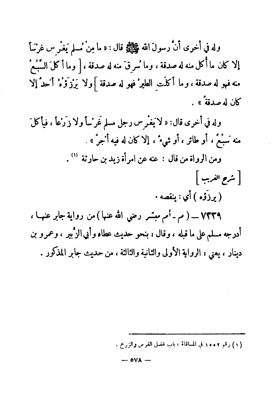 7339 - (م) أم مبشر - رضي الله عنها -: من رواية جابر عنها، أدرجه مسلم على ما قبله، وقال: بنحو حديث عطاء وأبي الزُّبير، وعمرو بن دينار، يعني: الرواية الأولى والثانية والثالثة، من حديث جابر المذكور.