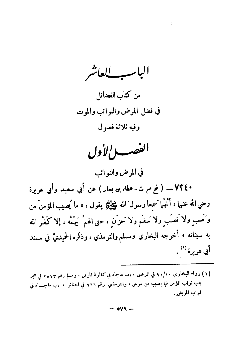 7340 - (خ م ت) عطاء بن يسار: عن أبي سعيد وأبي هريرة - رضي الله عنهما - أنَّهُما سَمِعا رسولَ الله - صلى الله عليه وسلم- يقول: «ما يُصيب المؤمنَ من وَصَب ولا نَصَب ولا سَقَم ولا حَزَن، حتى الهم يَهُمُّه، إلا كَفَّر الله به سيئاته» أخرجه البخاري ومسلم والترمذي. وذكره الحميديُّ في مسند أبي هريرة (¬1) . -[580]-