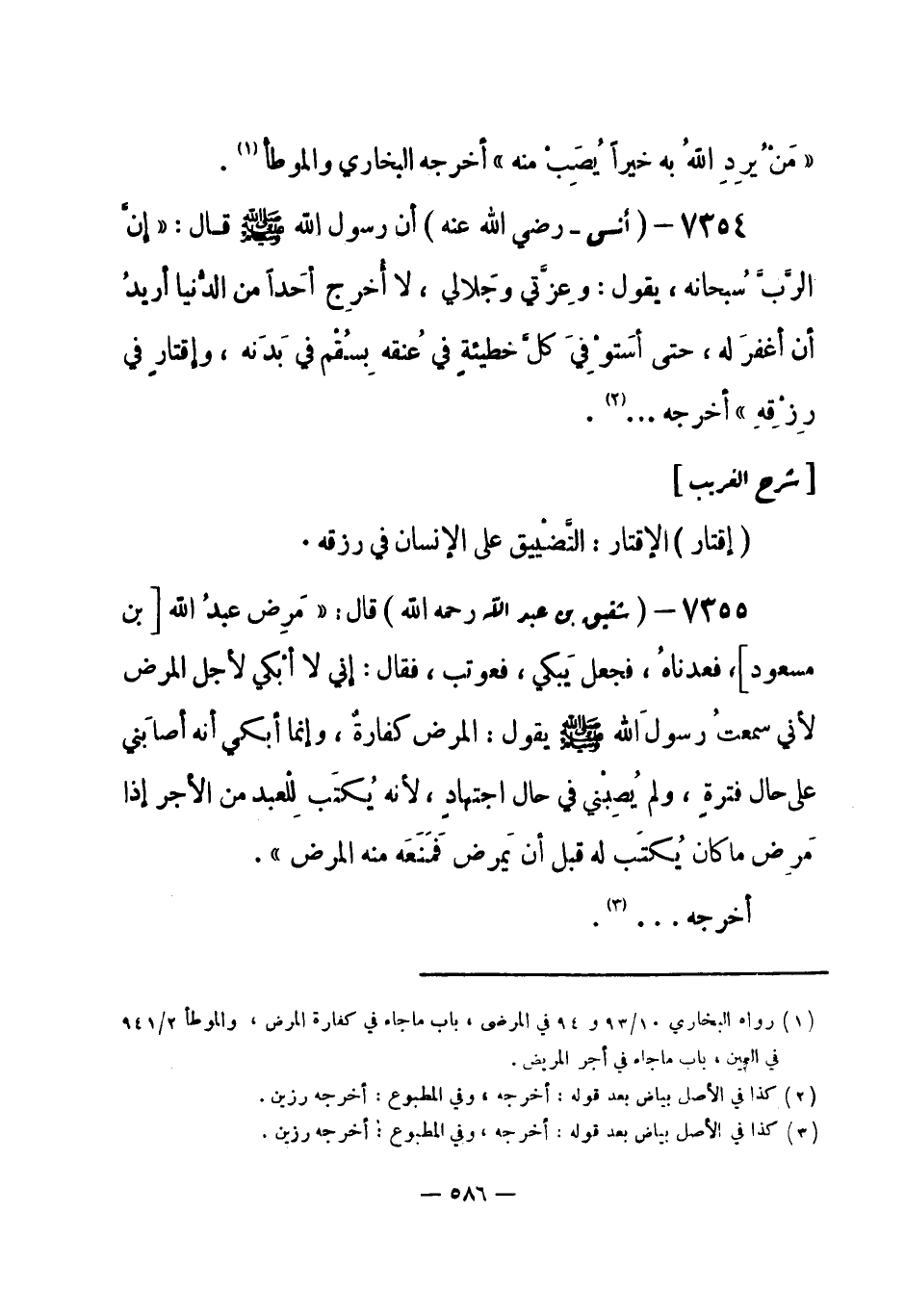 7354 - () أنس - رضي الله عنه - أن رسولَ الله - صلى الله عليه وسلم- قال: «إنَّ الرَّبَّ سُبحانه، يقول: وعِزَّتي وجَلالي، لا أخرِج أحَدا من الدُّنيا أريدُ أن أغفرَ له، حتى أستوْفِيَ كلَّ خطيئة في عُنقه، بِسُقْم في بَدَنه، وإقتار في رِزْقِه» . أخرجه ... (¬1) .