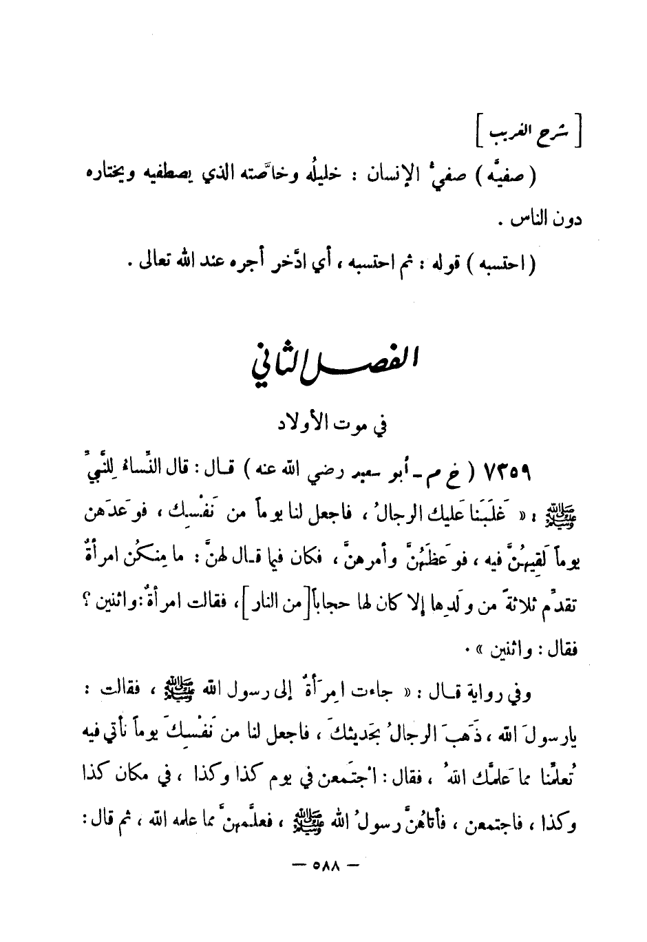 (¬1) رواه البخاري 1 / 175 في العلم، باب هل يجعل للنساء يوماً على حدة في العلم، وفي الجنائز، باب فضل من مات له ولد فاحتسب، وفي الاعتصام، باب تعليم النبي صلى الله عليه وسلم أمته من الرجال والنساء مما علمه الله ليس برأي ولا تمثيل، ومسلم رقم (2633) في البر والصلة، باب فضل من يموت له ولد فيحتسبه.