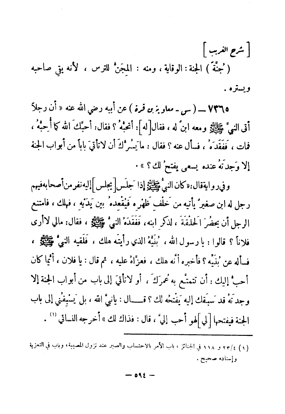 7365 - (س) معاوية بن قرة: عن أبيه - رضي الله عنه - «أن رجلاً أتى النبيَّ - صلى الله عليه وسلم- ومعه ابن له، فقال [له] : أتحبُّهُ؟ فقال: أحبَّكَ الله كما أحِبُّهُ، فمات، فَفَقَدَهُ، فسأل عنه؟ فقال: ما يَسُرُّكَ أن لا تأتيَ باباً من أبواب الجنة إلا وجدتَهُ عنده يسعى يفتحُ لك؟» .