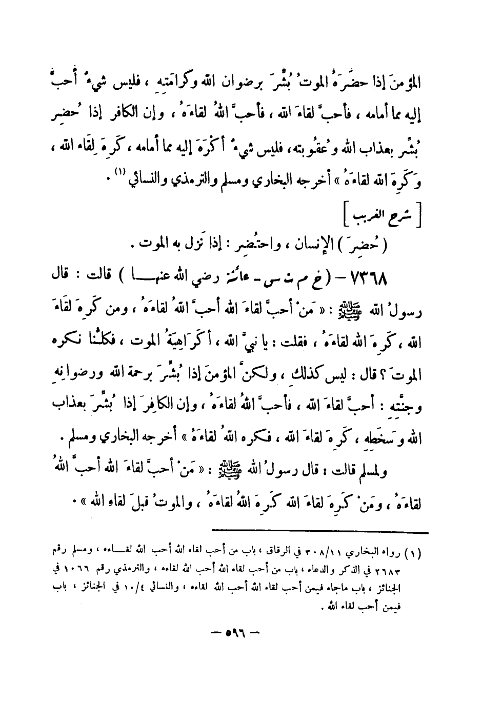 7368 - (خ م ت س) عائشة - رضي الله عنها - قالت: قال رسولُ الله - صلى الله عليه وسلم-: «مَنْ أحبَّ لقاء الله أحبَّ الله لِقاءه، ومن كَرِهَ لِقاءَ الله كَرِهَ الله لقاءه، فقلت: يا نبيَّ الله، أكَرَاهِيَةُ الموت، فكلُّنا نكره الموتَ؟ قال: ليس كذلك، ولكنَّ المؤمنَ إذا بُشِّرَ برحمة الله ورضوانِهِ وجنَّتِهِ: أحبَّ لقاء الله، فأحبَّ الله لقاءه، وإن الكافِرَ إذا بُشِّر بعذاب الله وسَخَطِهِ، كَرِهَ لِقاءَ الله، فكره الله لقاءه» أخرجه البخاري ومسلم.