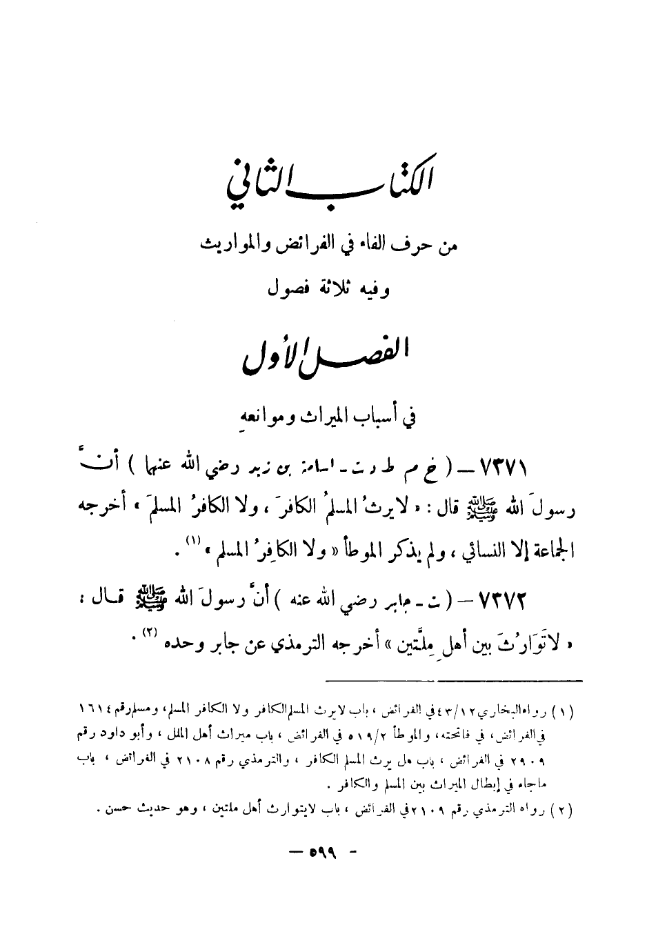 (¬1) رواه البخاري 12 / 43 في الفرائض، باب لا يرث المسلم الكافر ولا الكافر المسلم، ومسلم رقم (1614) في الفرائض، في فاتحته، والموطأ 2 / 519 في الفرائض، باب ميراث أهل الملل، وأبو داود رقم (2909) في الفرائض، باب هل يرث المسلم الكافر، والترمذي رقم (2108) في الفرائض، باب ما جاء في إبطال الميراث بين المسلم والكافر.