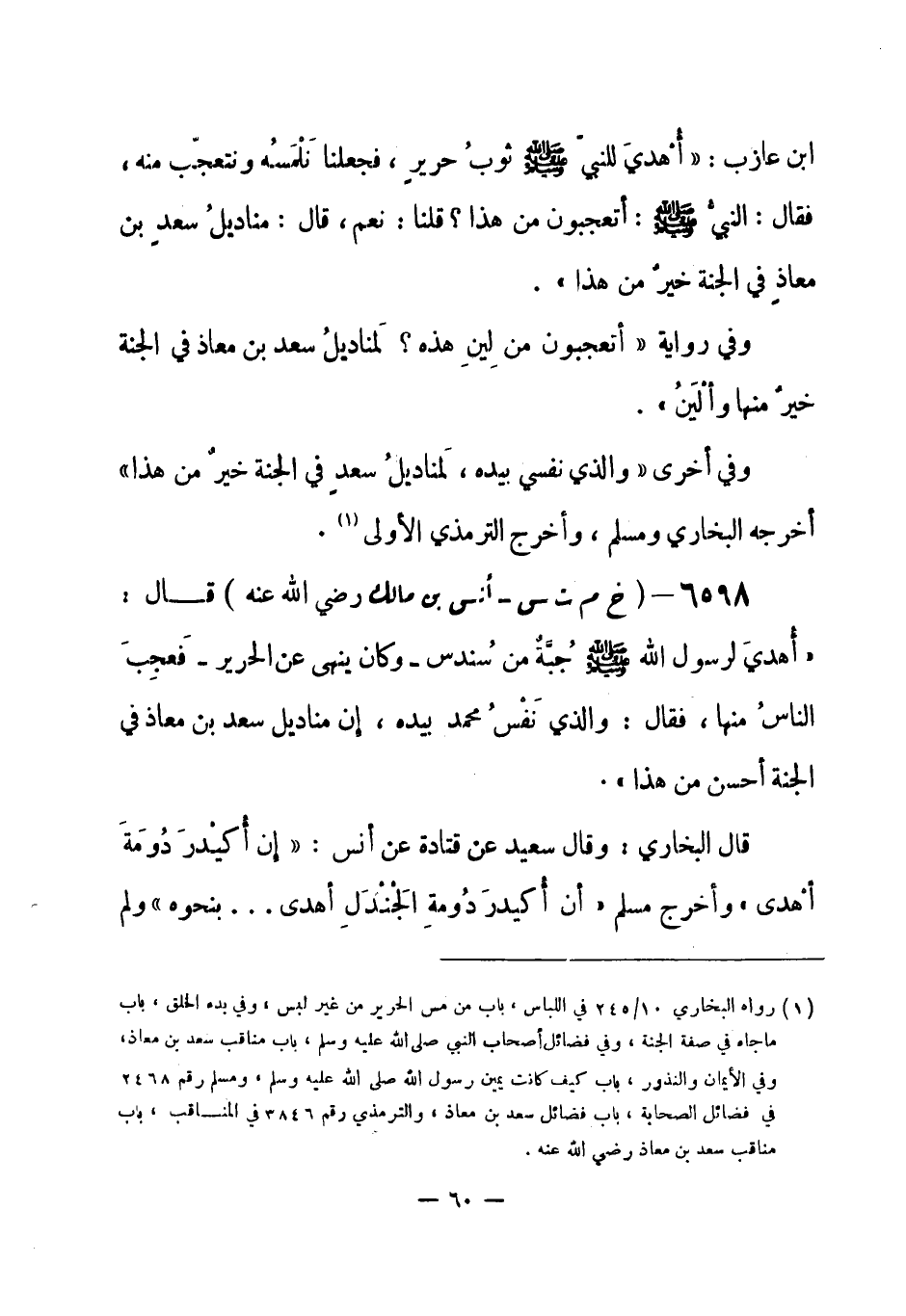 6598 - (خ م ت س) أنس بن مالك - رضي الله عنه - قال: «أُهديَ لرسول الله - صلى الله عليه وسلم- جُبَّة من سُندس - وكان ينهى عن الحرير - فَعجِبَ الناسُ منها، فقال: والذي نَفْسُ محمد بيده، إن مناديل سعد بن معاذ في الجنة أحسن من هذا» .