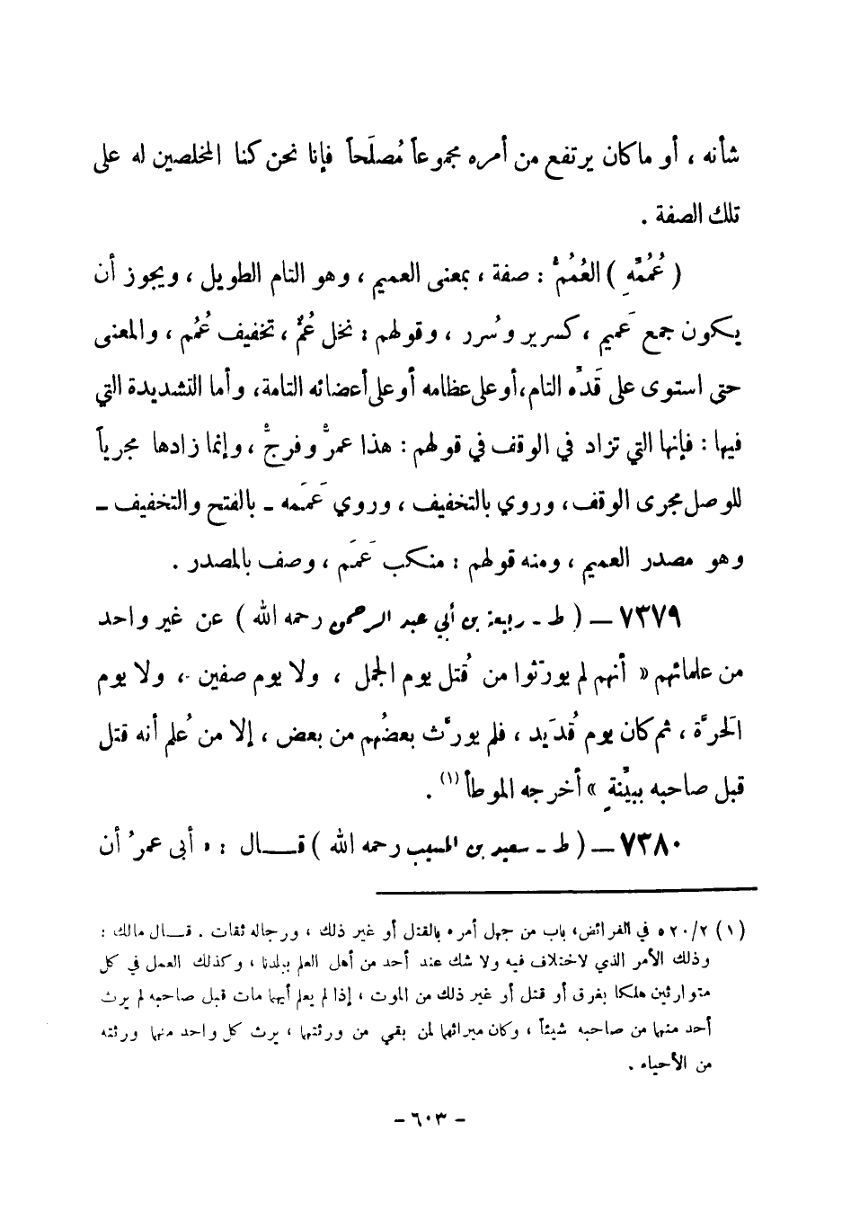7379 - (ط) ربيعة بن أبي عبد الرحمن - رحمه الله -: عن غير واحد من علمائهم «أنهم لم يورّثوا من قُتل يوم الجمل، ولا يوم صفين، ولا يوم الحَرَّة، ثم كان يوم قُدَيد، فلم يورَّث بعضُهم من بعض، إلا من عُلم أنه قتل قبل صاحبه ببيِّنة» أخرجه «الموطأ» (¬1) .