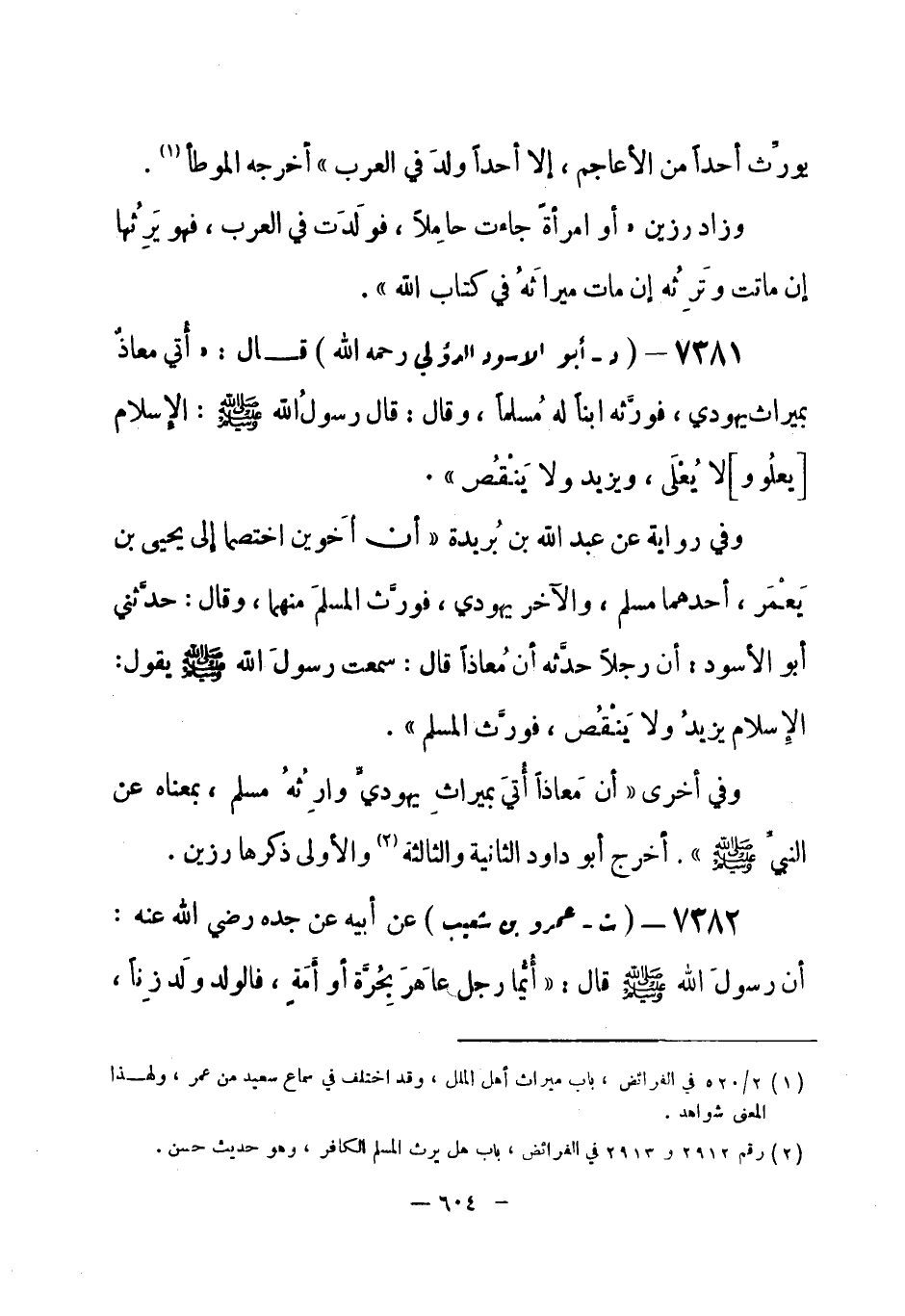 7381 - (د) أبو الأسود الدؤلي - رحمه الله -: قال: أُتِي معاذ بميراث يهودي، فورَّثه ابناً له مُسلماً، وقال: قال رسولُ الله - صلى الله عليه وسلم-: «الإسلام [يعلُو و] لا يُعْلى، ويزيد ولا يَنْقُص» .