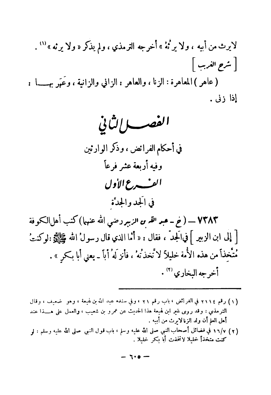 7383 - (خ) عبد الله بن الزبير - رضي الله عنهما -: كتب أهل الكوفة [إلى ابن الزبير] في الجَدِّ، فقال: أمَّا الذي قال رسولُ الله - صلى الله عليه وسلم-: «لو كنتُ مُتَّخِذاً من هذه الأمة خليلاً لاتَّخذتُهُ، فأنزلَه أباً - يعني أبا بكر» .