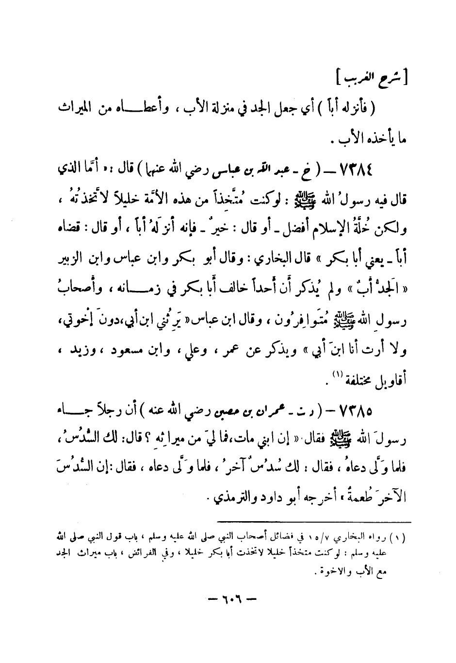 7385 - (د ت) عمران بن حصين - رضي الله عنه -: أن رجلاً جاء رسولَ الله - صلى الله عليه وسلم- فقال: إن ابني مات، فما ليَ من ميراثِهِ؟ قال: لك السُّدُسُ، فلما وَلَّى دعاهُ، فقال: «لك سُدُس آخرُ، فلما وَلَّى دعاه، فقال: إن السُّدُسَ الأخرَ طُعمة» أخرجه أبو داود والترمذي. -[607]-