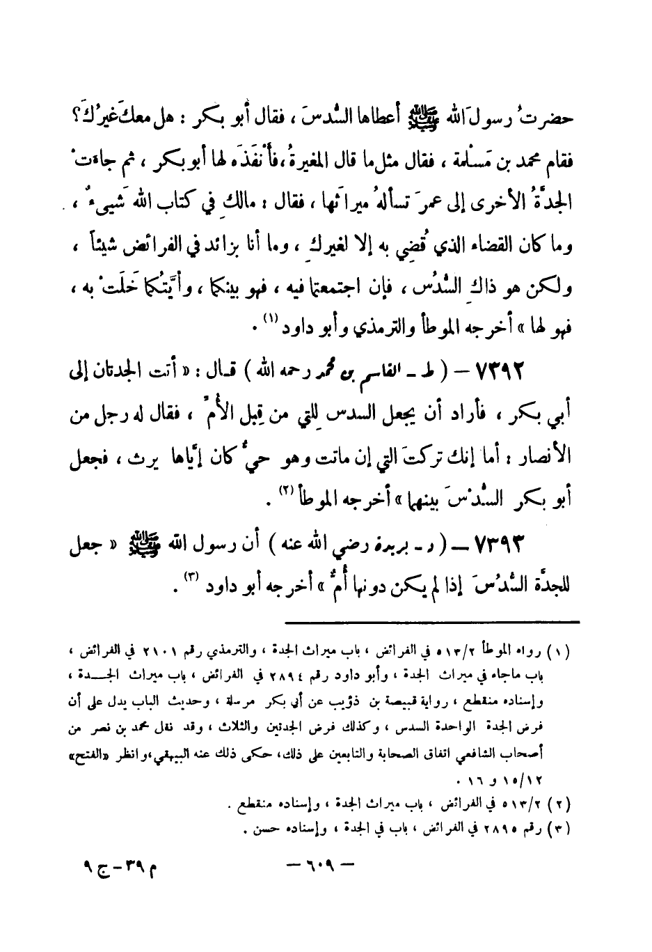 7393 - (د) بريدة - رضي الله عنه - أن رسولَ الله - صلى الله عليه وسلم- «جعل للجدَّةِ السُّدُسَ إذا لم يكن دونها أمّ» . أخرجه أبو داود (¬1) .
