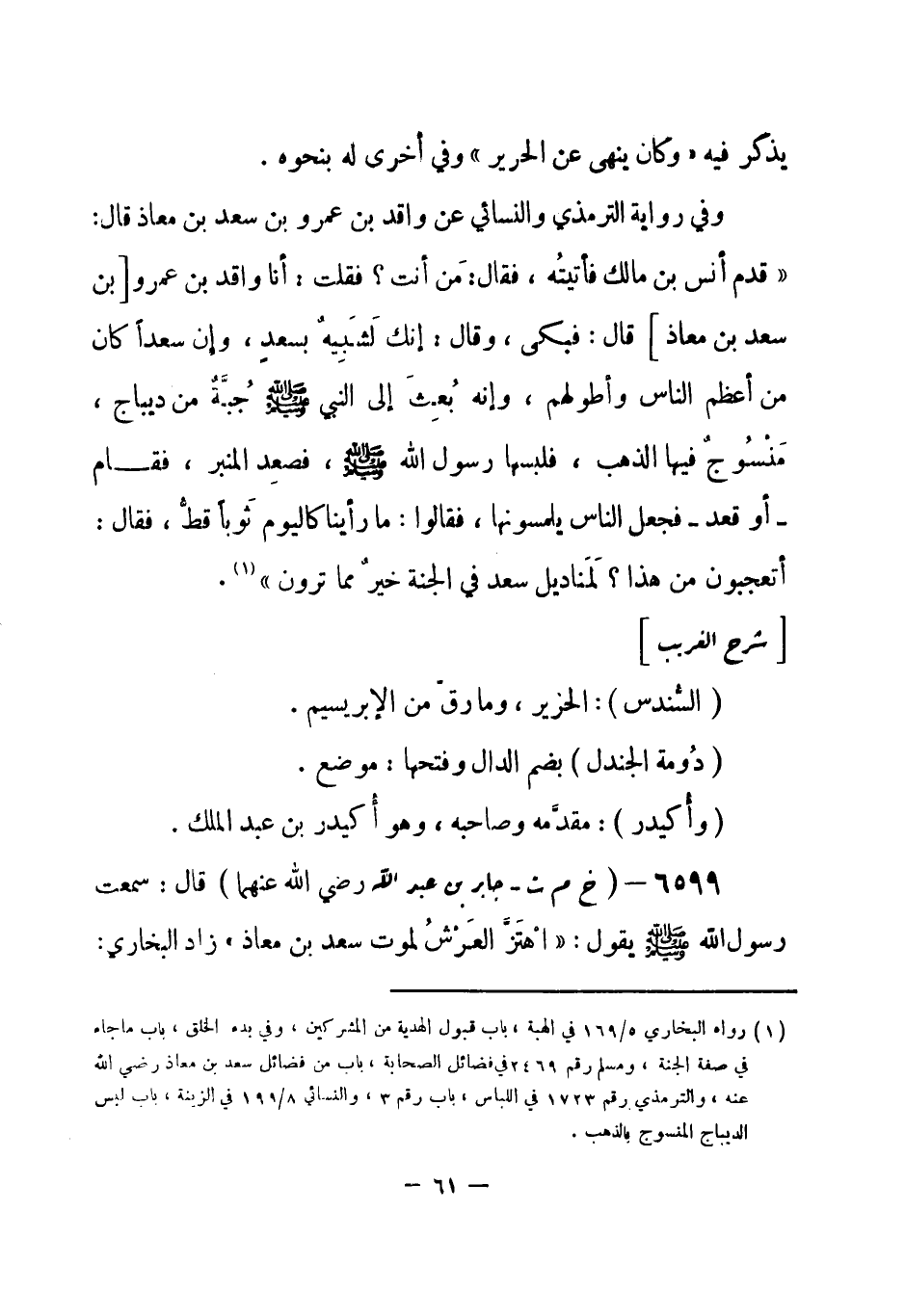(¬1) رواه البخاري 7 / 93 في فضائل أصحاب النبي صلى الله عليه وسلم، باب مناقب سعد بن معاذ، ومسلم رقم (2467) في فضائل الصحابة، باب من فضائل سعد بن معاذ، والترمذي رقم (3847) في المناقب، باب مناقب سعد بن معاذ رضي الله عنه.