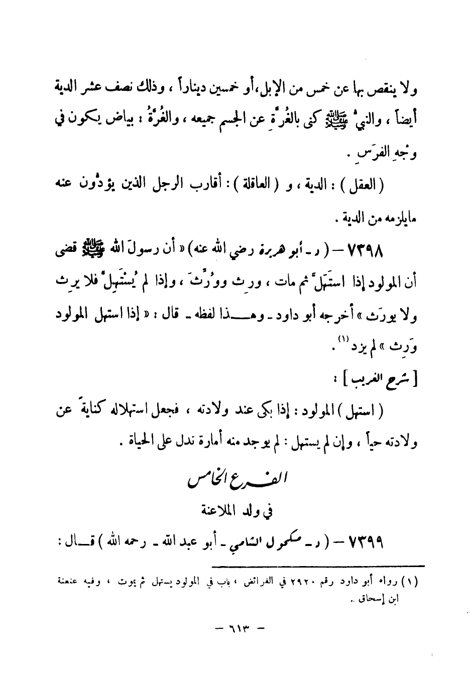 7398 - (د) أبو هريرة - رضي الله عنه -: «أن رسولَ الله - صلى الله عليه وسلم- قضى أن المولود إذا استَهَلَّ ثم مات، ورِث ووُرِّثَ، وإذا لم يُسْتَهِلَّ فلا يرِث ولا يورَث» أخرجه أبو داود - وهذا لفظه - قال: «إذا استهل المولود وَرِث» لم يزد (¬1) .