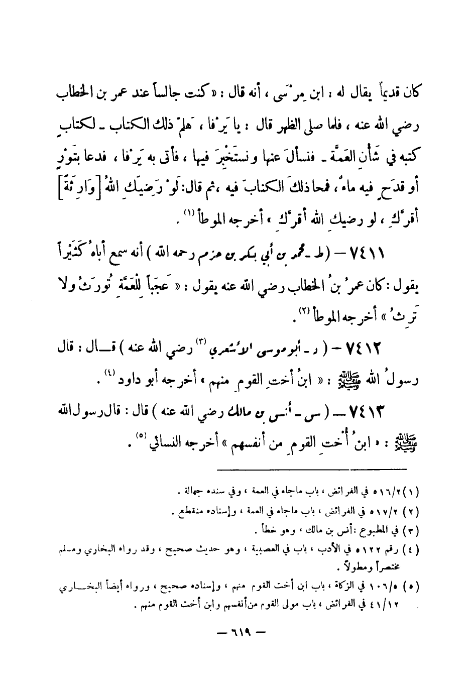 7412 - (د) أبو موسى الأشعري (¬1) - رضي الله عنه - قال: قال رسولُ الله - صلى الله عليه وسلم-: «ابنُ أختِ القومِ منهم» أخرجه أبو داود (¬2) .