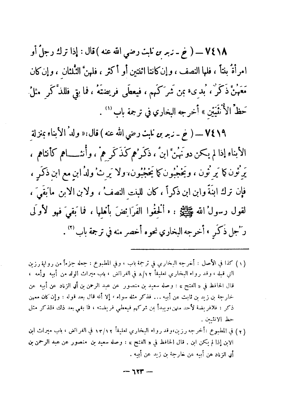 7418 - (خ) زيد بن ثابت - رضي الله عنه - قال: «إذا ترك رجل أو امرأة بنتاً، فلها النصف، وإن كانتا اثنتين أو أكثر، فلهنَّ الثُّلثانِ، وإن كان مَعَهُنَّ ذَكَر، بُدِئَ بمن شَرَكَهم، فيعطَى فريضتَهُ، فما بقي فللذَّكَرِ مثلُ حَظِّ الأُنْثَيَيْنِ» أخرجه البخاري في ترجمة باب (¬1) .
