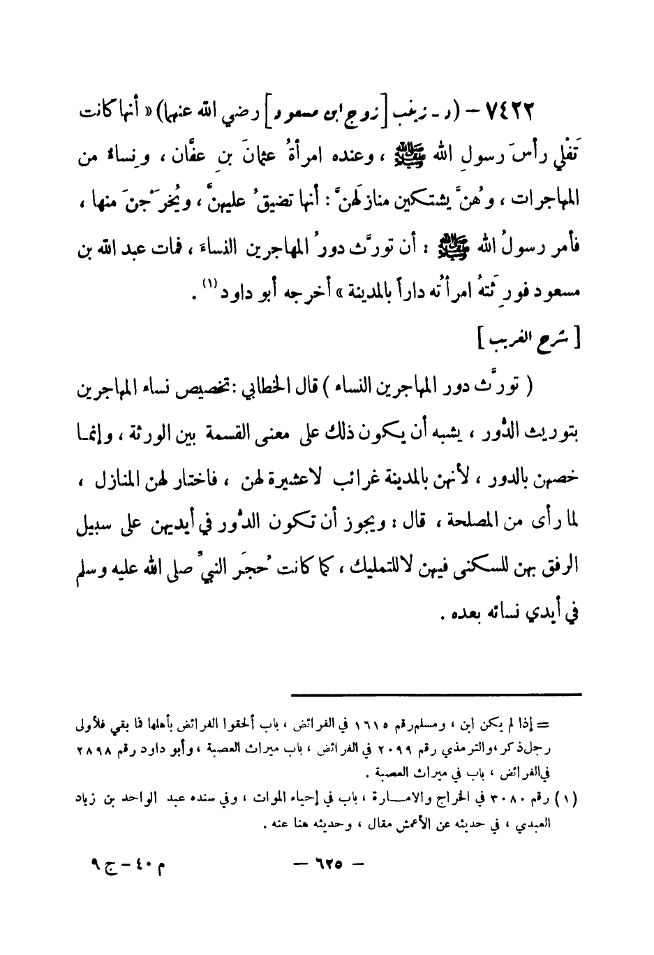 7422 - (د) زينب [زوج ابن مسعود]- رضي الله عنهما -: «أنها كانت تَفْلي رأسَ رسولِ الله - صلى الله عليه وسلم-، وعنده امرأةُ عثمانَ بنِ عفَّان، ونِساءٌ من المهاجرات، وهُنَّ يشتكين منازلَهنَّ: أنها تضيقُ عليهنَّ، ويُخرَجْنَ منها، فأمر رسولُ الله - صلى الله عليه وسلم-: أن تورَّث دورُ المهاجرين النساءَ، فمات عبد الله بن مسعود فورِثَتهُ امرأتُه داراً بالمدينة» أخرجه أبو داود (¬1) .