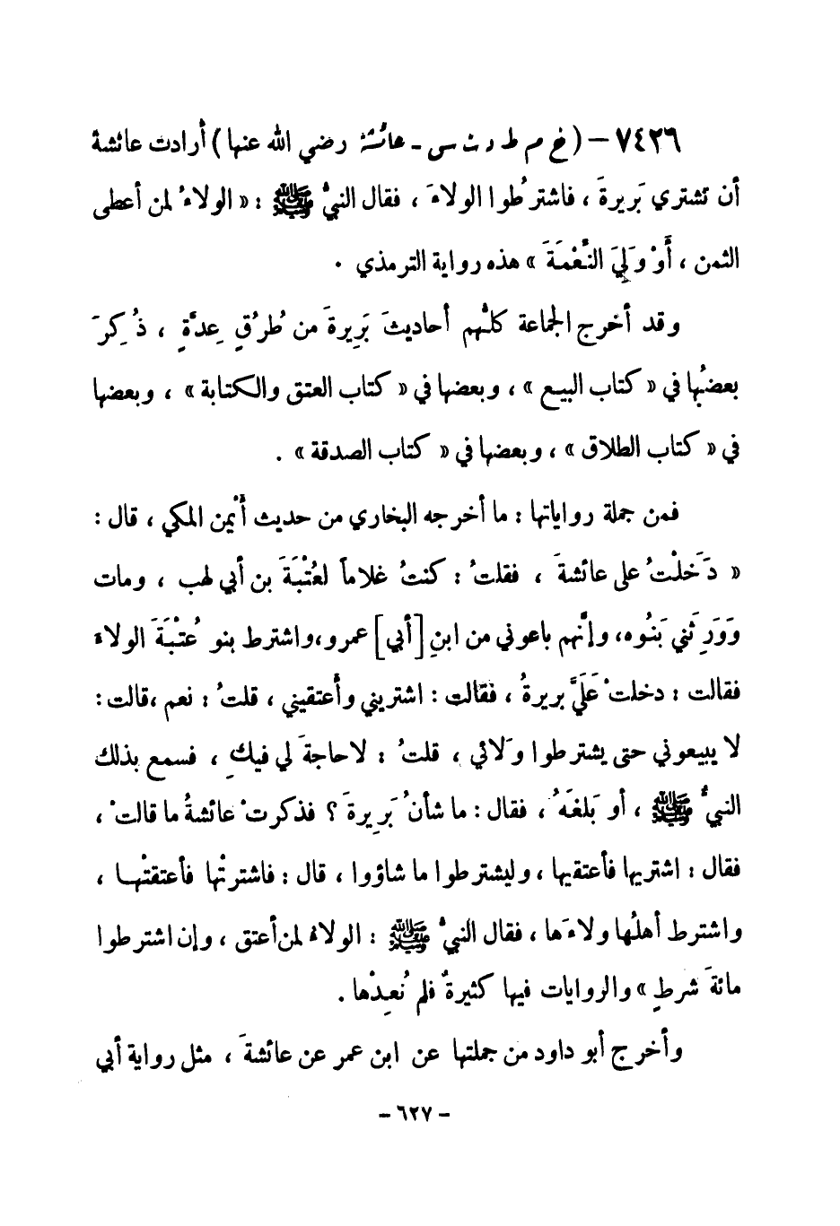 7426 - (خ م ط د ت س) عائشة - رضي الله عنها - أرادت عائشة أن تشتريَ بَريرةَ، فاشترطُوا الولاء، فقال النبيُّ - صلى الله عليه وسلم-: «الولاءُ لمن أعطى الثمن، أوْ وَلِي النِّعْمَةَ» هذه رواية الترمذي.