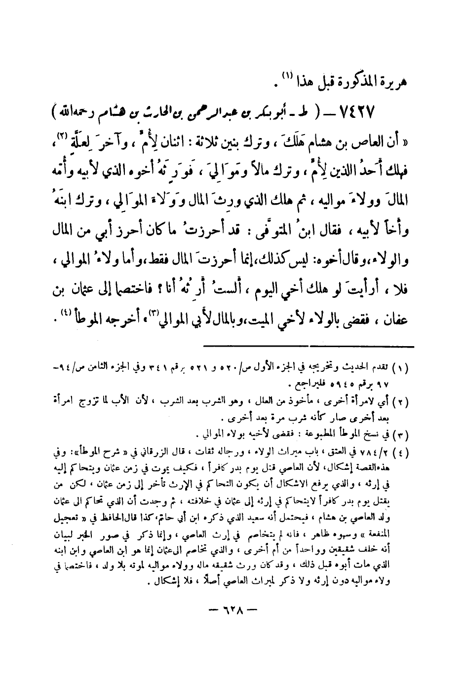 7427 - (ط) أبو بكر بن عبد الرحمن بن الحارث بن هشام - رحمه الله -: «أن العاص ابن هشام هَلَكَ، وترك بنين ثلاثة: اثنان لأمّ، وآخرَ لِعَلَّة (¬1) ، فهلك أحَدُ اللذين لأمّ، وترك مالاً ومَوَاليَ، فَوَرِثَهُ أخوه الذي لأبيه وأمِّه المالَ وولاءَ مواليه، ثم هلك الذي ورِثَ المال، ووَلاءَ الموَالِي، وترك ابنَهُ وأخاً لأبيه، فقال ابنُ المتوفَّى: قد أحرزتُ ما كان أحرز أبي من المال والولاء، وقال أخوه: ليس كذلك إنما أحرزت المال فقط، وأما ولاءُ الموالي، فلا، أرأيتَ لو هلك أخي اليوم، ألستُ أرِثُهُ أنا؟ فاختصما إلى عثمان بن عفان، فقضى بالولاءِ لأخي الميت، وبالمال لأبي الموالي (¬2) » أخرجه «الموطأ» (¬3) .