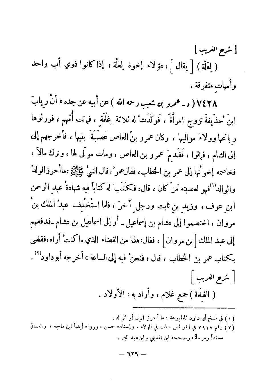 7428 - (د) عمرو بن شعيب - رحمه الله -: عن أبيه عن جده «أنَّ رِيابَ بنَ حُذَيفةَ تزوج امرأة، فَوَلَدَتْ له ثلاثة غِلْمَة، فماتت أمُّهم، فورثوها رِباعَها وولاءَ مواليها، وكان عمرو بنُ العاص عَصَبَةَ بنيها، فأخرجهم إلى الشام، فماتوا، فَقَدِمَ عمرو بن العاص، ومات مولى لها، وترك مالاً، فخاصمه إخوتُها إلى عمر بن الخطاب، فقال عمرُ: قال النبيُّ - صلى الله عليه وسلم-: «ما أحرز الولدُ والوالد (¬1) فهو لعصبته مَنْ كان» قال: فَكَتَبَ له كتاباً فيه شهادةُ عبدِ الرحمن بن عوف، وزيدِ بنِ ثابت ورجل آخرَ، فلما استُخْلِف عبدُ الملك بنُ مروان، اختصموا إلى هشام بن إسماعيل - أو إلى إسماعيل بن هشام - فدفعهم إلى عبد الملك [بن مروان] ، فقال: هذا من القضاء الذي ما كنتُ أراه، فقضى بكتاب عمر بن الخطاب، قال: فنحنُ فيه إلى الساعة» أخرجه أبو داود (¬2) .