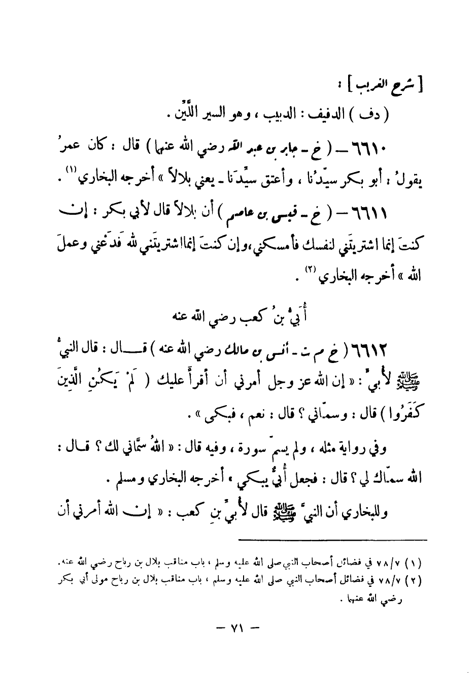 6610 - (خ) جابر بن عبد الله - رضي الله عنهما - قال: «كان عمرُ يقولُ: أبو بكر سيدنا، وأعتق سيِّدَنا - يعني بلالاً» أخرجه البخاري (¬1) .