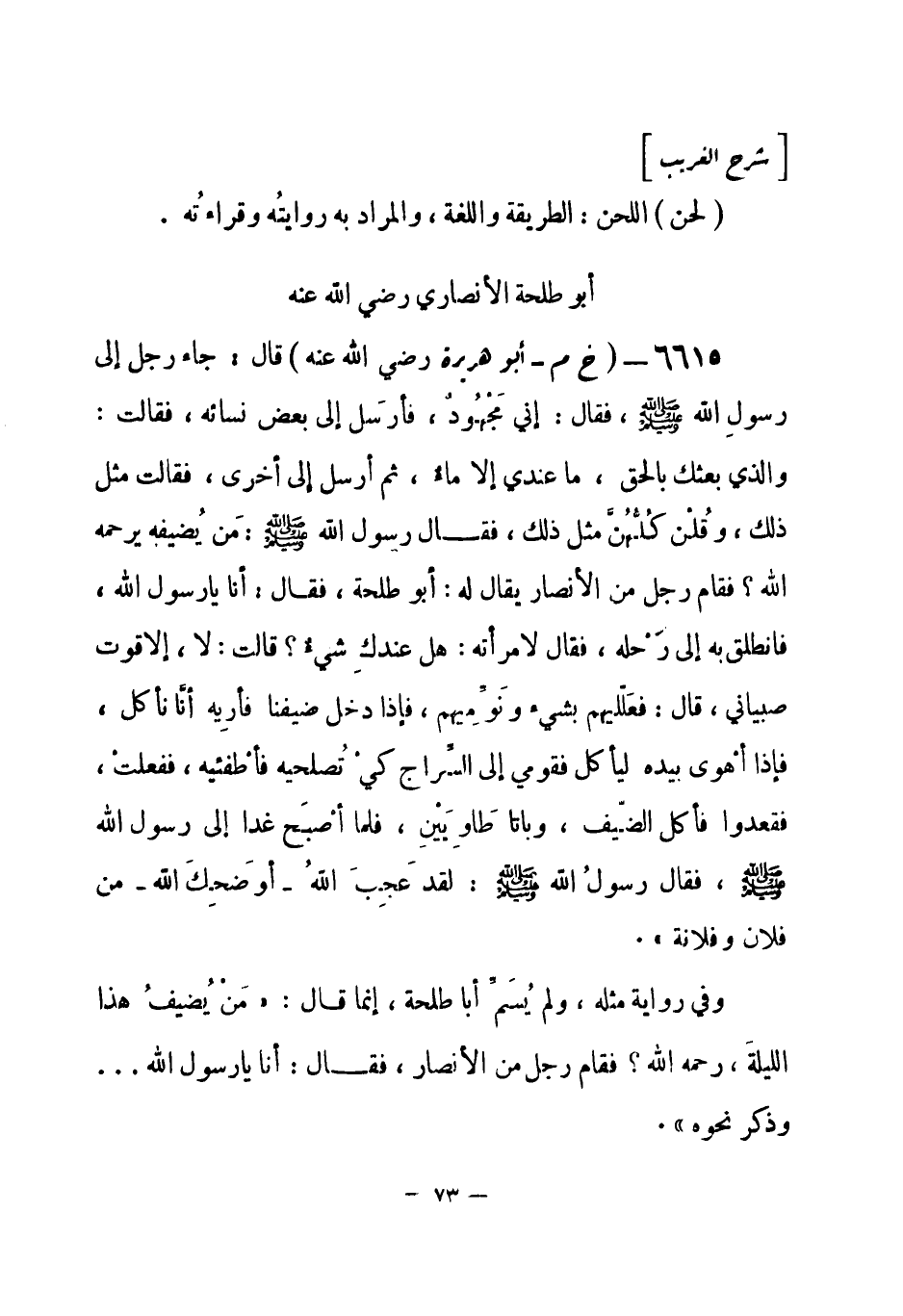 6615 - (خ م) أبو هريرة - رضي الله عنه - قال: جاء رجل إلى رسولِ الله - صلى الله عليه وسلم-، فقال: إني مَجْهُود، فأرسَل إلى بعض نسائه، فقالت: والذي بعثك بالحق، ما عندي إلا ماء، ثم أرسل إلى أخرى، فقالت: مثل ذلك، وقُلْن كُلُّهُنَّ مثل ذلك، فقال رسولُ الله - صلى الله عليه وسلم-: «مَن يُضيفه يرحمه الله؟» فقام رجل من الأنصار يقال له: أبو طلحة، فقال: أنا يا رسول الله، فانطلق به إلى رَحْله، فقال لامرأته: هل عندكِ شيء؟ قالت: لا، إلا قوت صبياني، قال: فعَلّليهم بشيء ونَوِّمِيهم، فإذا دخل ضيفنا فأرِيه أنَّا نأكل، فإذا أهْوى بيده ليأكل فقومي إلى السِّراج كي تُصلحيه فأطْفئيه، ففعلتْ، فقعدوا فأكل الضّيف، وباتا طَاوِيَيْن، فلما أصْبح غدا إلى رسول الله - صلى الله عليه وسلم-، فقال رسولُ الله - صلى الله عليه وسلم-: «لقد عَجِبَ الله - أو ضَحِكَ الله - من فلان وفلانة» .