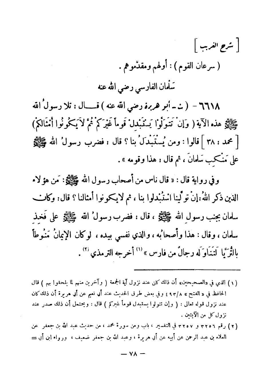 6618 - (ت) أبو هريرة - رضي الله عنه - قال: «تلا رسولُ الله - صلى الله عليه وسلم- هذه الآية {وَإنْ تَتَوَلَّوْا يَسْتَبْدِلْ قَوماً غَيْرَكُمْ ثُمَّ لاَ يَكُونُوا أمْثَالَكُمْ} [محمد: 38] قالوا: ومن يُسْتَبْدَلُ بنا؟ قال: فضرب رسولُ الله - صلى الله عليه وسلم- على مَنْكِب سَلمانَ، ثم قال: هذا وقومه» .