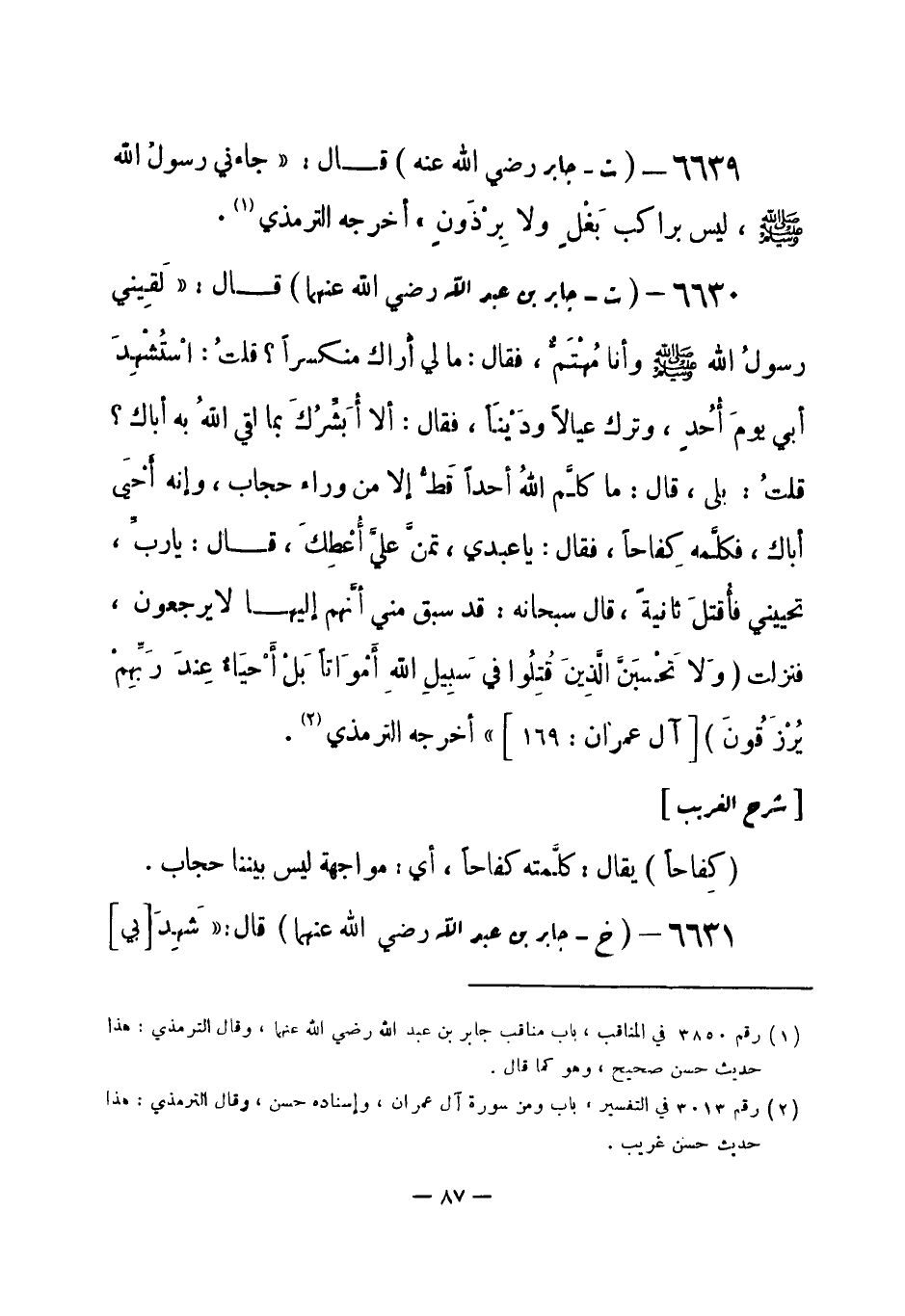 6630 - (ت) جابر بن عبد الله - رضي الله عنهما - قال: «لَقِيني رسولُ الله - صلى الله عليه وسلم- وأنا مُهْتَمّ، فقال: ما لي أراك منكسراً؟ قلتُ: اسْتُشْهِدَ أبي يومَ أُحُد، وترك عيالاً ودَيْناً، فقال: ألا أُبَشِّرُكَ بما لقي الله به أباك؟ قلتُ: بلى، قال: ما كلَّم الله أحداً قطُّ إلا من وراء حجاب، وإنه أحْيىَ أباك، فكلَّمه كِفاحاً، فقال: يا عبدي، تمنَّ عليَّ أُعْطِكَ، قال: يا ربِّ، تحييني فأُقتل ثانية، قال سبحانه: قد سبق مني أنَّهم إليها لا يرجعون، فنزلت {وَلاَ تَحْسَبَنَّ الَّذِينَ قُتِلُوا في سَبِيلِ اللهِ أَمْوَاتاً بَلْ أَحْيَاءٌ عِندَ رَبِّهِمْ يُرْزَقُونَ} [آل عمران: 169] » أخرجه الترمذي (¬1) .