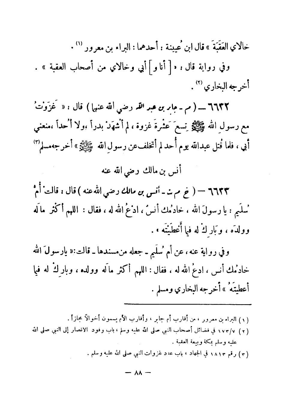 (¬2) رواه البخاري 11 / 117 في الدعوات، باب قول الله تعالى: {وصل عليهم} ، وباب دعوة النبي صلى الله عليه وسلم لخادمه بطول العمر وبكثرة ماله، وباب الدعاء بكثرة المال مع البركة، وباب الدعاء بكثرة الولد مع البركة، وفي الصوم، باب من زار قوماً فلم يفطر عندهم، ومسلم رقم (660) في المساجد، باب جواز الجماعة في النافلة، ورقم (2480) و (2481) في فضائل الصحابة، باب من فضائل أنس بن مالك رضي الله عنه، والترمذي رقم (3827) و (3828) في المناقب، باب مناقب أنس بن مالك رضي الله عنه.