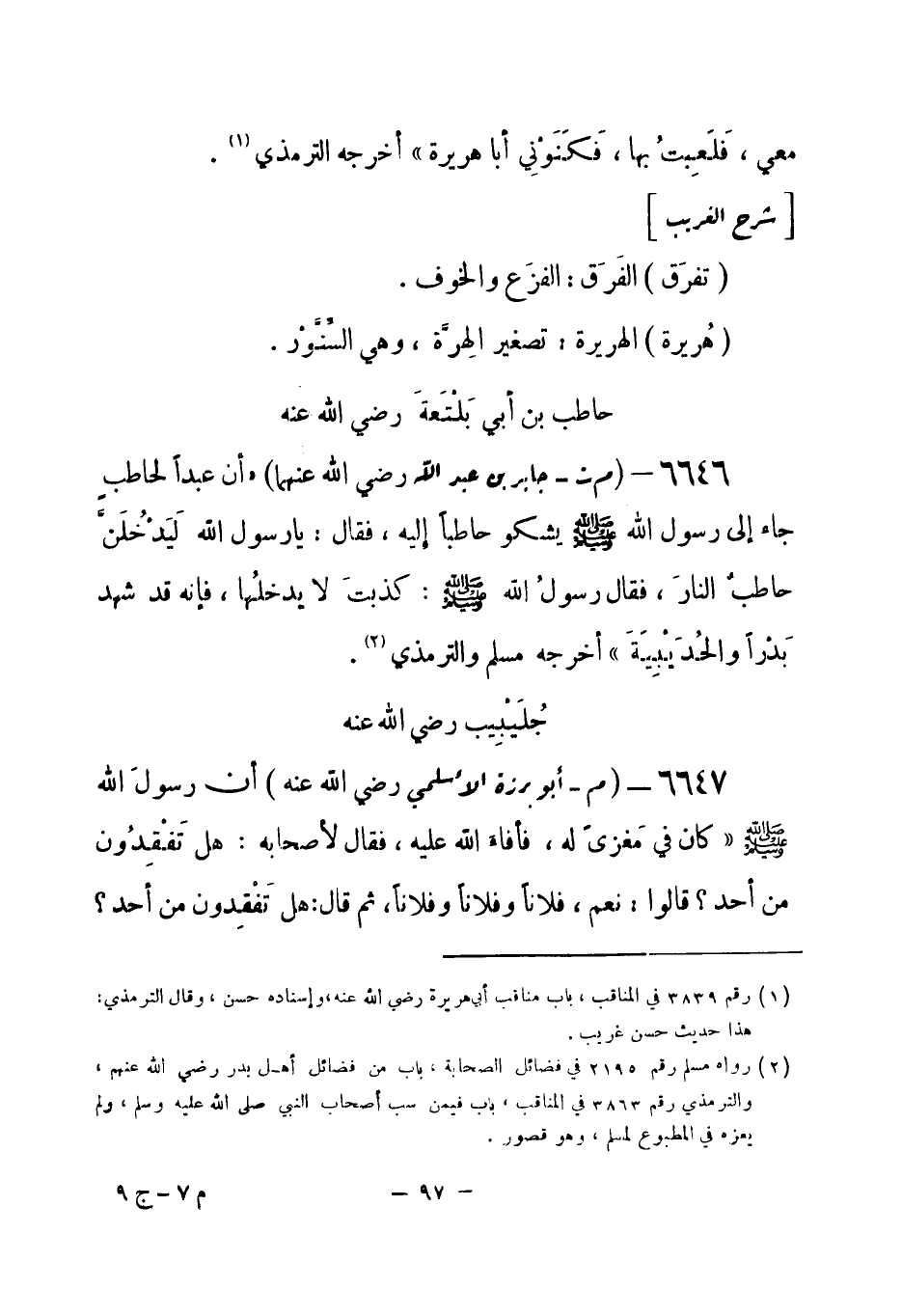 (¬1) رواه مسلم رقم (2195) في فضائل الصحابة، باب من فضائل أهل بدر رضي الله عنهم، والترمذي رقم (3863) في المناقب، باب فيمن سب أصحاب النبي صلى الله عليه وسلم، ولم يعزه في المطبوع لمسلم، وهو قصور.