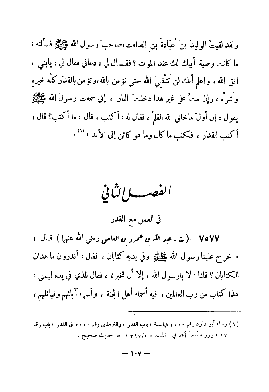 (¬1) رقم (2142) في القدر، ما جاء أن الله كتب كتاباً لأهل الجنة وأهل النار، ورواه أيضاً أحمد في " المسند " 2 / 167، وإسناده حسن، وقال الترمذي: هذا حديث حسن صحيح غريب.