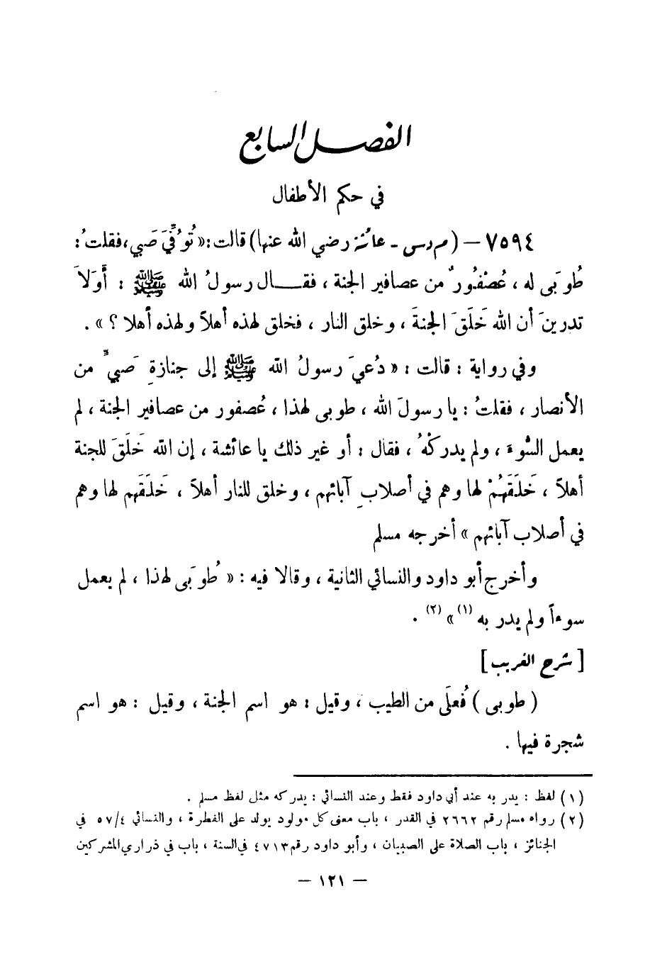 7594 - (م د س) عائشة - رضي الله عنها - قالت: «تُوُفِّيَ صَبي، فقلتُ: طُوَبى له، عُصفُور من عصافير الجنة، فقال رسولُ الله - صلى الله عليه وسلم-: أَوَلاَ تدرينَ أن الله خَلَقَ الجنةَ، وخلق النار، فخلق لهذه أهلاً ولهذه أهلاً؟» .
