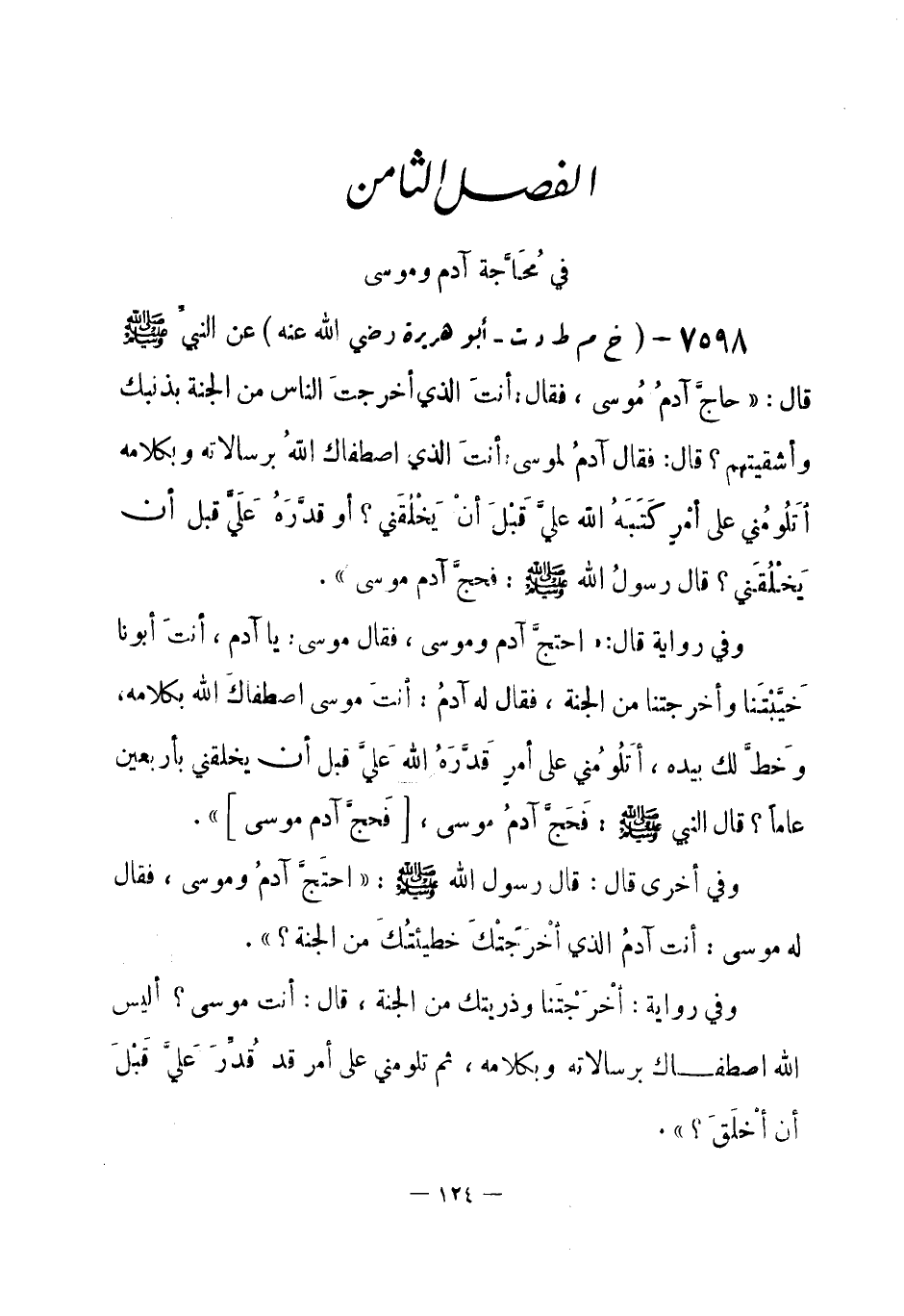 7598 - (خ م ط د ت) أبو هريرة - رضي الله عنه - عن النبيِّ - صلى الله عليه وسلم- قال: «حاجَّ آدمُ مُوسى، فقال: أنتَ الذي أخرجتَ الناس من الجنة بذنبك وأشقيتهم؟ قال: فقال آدمُ لموسى: أنتَ الذي اصطفاك الله برسالاته وبكلامه أتَلُوُمني على أمْرِ كَتَبهُ الله عليَّ قَبْلَ أنْ يَخْلُقَني؟ أو قدَّرَهُ عَلَيَّ قبل أن يَخْلُقَني؟ قال رسولُ الله - صلى الله عليه وسلم-: فحجَّ آدم موسى» .