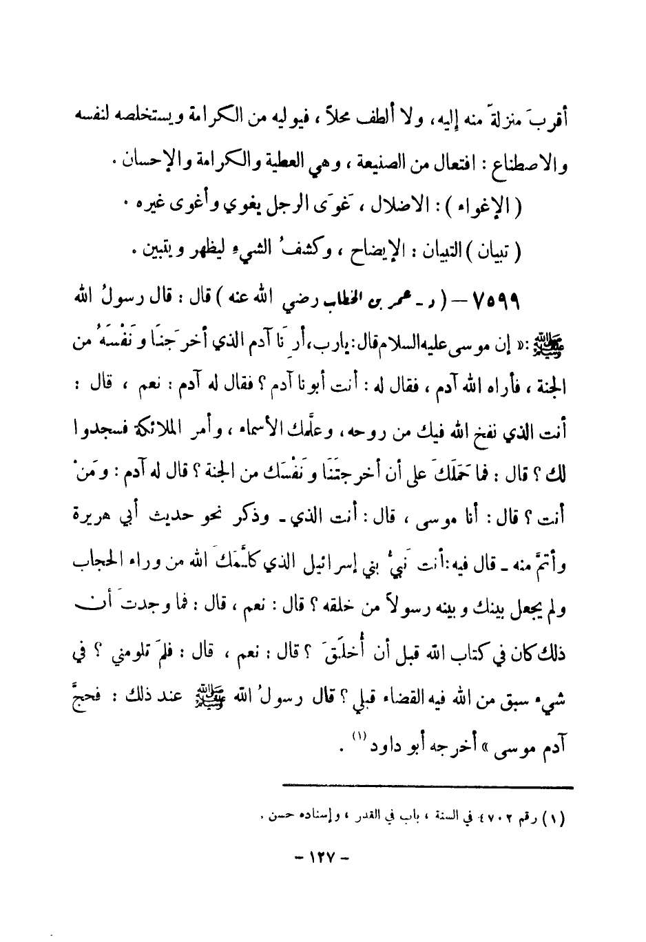 7599 - (د) عمر بن الخطاب - رضي الله عنه - قال: قال رسولُ الله - صلى الله عليه وسلم-: «إن موسى عليه السلام قال: يا رب أرِنَا آدم الذي أخرجَنَا ونَفْسَهُ من الجنة، فأراه الله آدم، فقال له: أنت أبونا آدم؟ فقال له آدم: نعم، قال: أنت الذي نفخ الله فيك من روحه، وعلَّمك الأسماء، وأمر الملائكة فسجدوا لك؟ قال: فما حَمَلكَ على أن أخرجتَنَا ونَفْسَك من الجنة؟ قال له آدم: ومَن أنت؟ قال: أنا موسى، قال: أنت الذي - وذكر نحو حديث أبي هريرة وأتمَّ منه - قال فيه: أنت نَبيُّ بني إسرائيل الذي كلَّمكَ الله من وراء الحجاب ولم يجعل بينك وبينه رسولاً من خلقه؟ قال: نعم، قال: فما وجدتَ أن ذلك كان في كتاب الله قبل أن أُخلَقَ؟ قال: نعم، قال: فلم تلومني في شيء سبق من الله فيه القضاء قبلي؟ قال رسولُ الله - صلى الله عليه وسلم- عند ذلك: فحجَّ آدم موسى» أخرجه أبو داود (¬1) .
