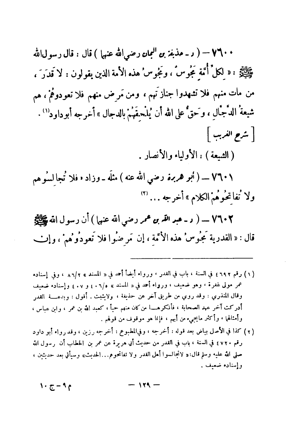 7600 - (د) حذيفة بن اليمان - رضي الله عنهما - قال: قال رسولُ الله - صلى الله عليه وسلم-: «لِكلِّ أمَّة مَجُوس، ومَجُوسُ هذه الأمة الذين يقولون: لا قَدَرَ، من مات منهم فلا تشهدوا جنازَتهم، ومن مَرِض منهم فلا تعودوهُم، هم شيعةُ الدَّجَّالِ، وحَق على الله أن يُلْحِقَهُمْ بالدجال» أخرجه أبو داود (¬1) .