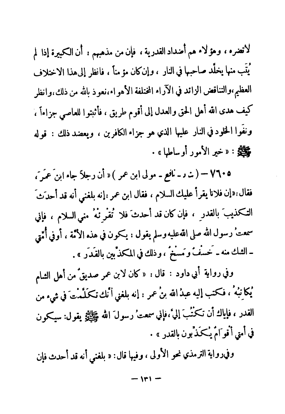 7605 - (ت د) نافع - مولى ابن عمر «أن رجلاً جاء ابنَ عمَرَ فقال: إن فلاناً يقرأ عليك السلام، فقال ابن عمر: إنه بلغني أنه قد أحدَثَ التكذيبَ بالقدرِ، فإن كان قد أحدثَ فلا تُقْرِئْهُ مني السلام، فإني سمعتُ رسول الله - صلى الله عليه وسلم- يقول: يكون في هذه الأمَّة، أو في أُمَّتي - الشك منه - خَسْفٌ ومَسْخ، وذلك في المكذِّبين بالقَدَر» .