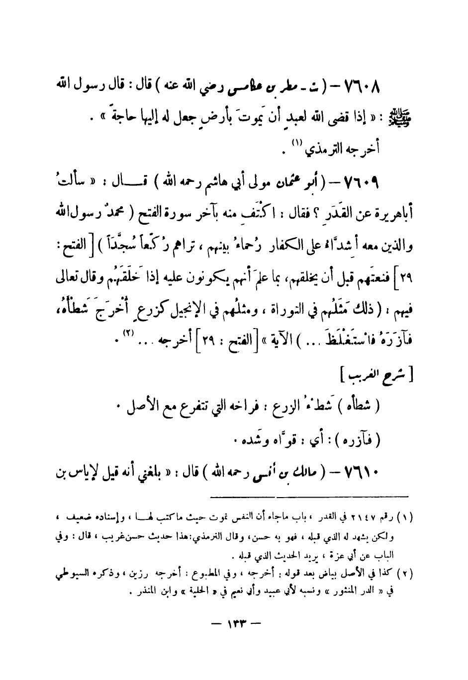 7609 - () أبو عثمان مولى أبي هاشم - رحمه الله - قال: «سألتُ أبا هريرة عن القَدَرِ؟ فقال: اكْتفِ منه بآخر سورة الفتح {محمدٌ رسول الله والذين معه أشِدَّاءُ على الكفار رُحماءُ بينهم تراهم رُكَّعاً سُجَّدَاً} [الفتح: 29] فنعتَهم قبل أن يخلقهم، بما علمَ أنهم يكونون عليه إذا خَلَقَهُم وقال تعالى فيهم: {ذلك مَثَلُهم في التوراة ومثلُهم في الإنجيل كزرعٍ أَخْرَجَ شَطْأَهُ فآزَرَهُ فاسْتَغْلَظَ ... } الآية» [الفتح: 29] أخرجه ... (¬1) .