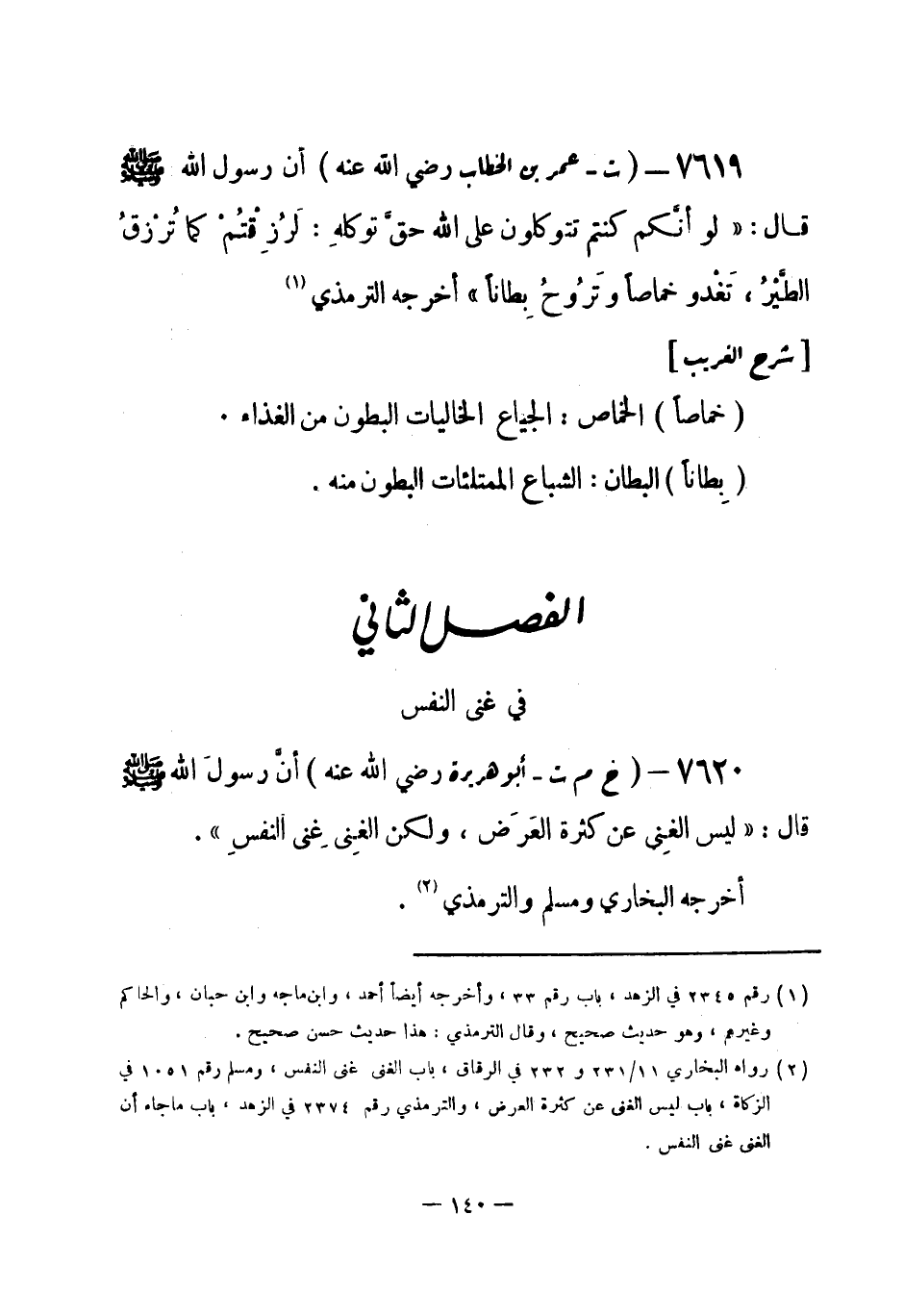7620 - (خ م ت) أبو هريرة - رضي الله عنه - أنَّ رسولَ الله - صلى الله عليه وسلم- قال: «ليس الغِنى عن كثرة العَرَض، ولكن الغِنى غنى النفسِ» . أخرجه البخاري ومسلم والترمذي (¬1) .