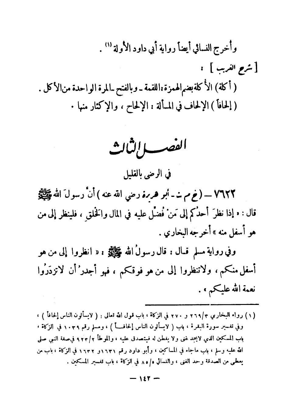 7622 - (خ م ت) أبو هريرة - رضي الله عنه - أنَّ رسولَ الله - صلى الله عليه وسلم- قال: «إذا نظرَ أحدُكم إلى مَنْ فُضِّل عليه في المال والَخْلقِ، فلينظر إلى من هو أسفل منه» أخرجه البخاري.