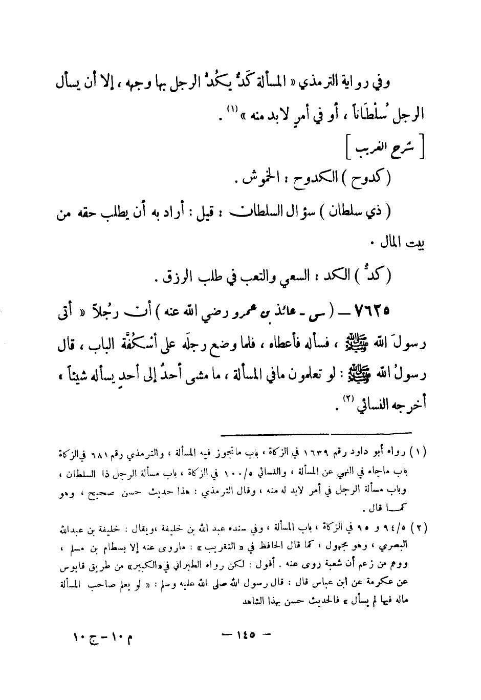 7625 - (س) عائذ بن عمرو - رضي الله عنه - أن رجلاً «أتى رسولَ الله - صلى الله عليه وسلم-، فسأله فأعطاه، فلما وضع رجلَه على أسْكُفَّة الباب، قال رسولُ الله - صلى الله عليه وسلم-: لو تعلمون ما في المسألة، ما مشى أحد إلى أحد يسأله شيئاً» أخرجه النسائي (¬1) .
