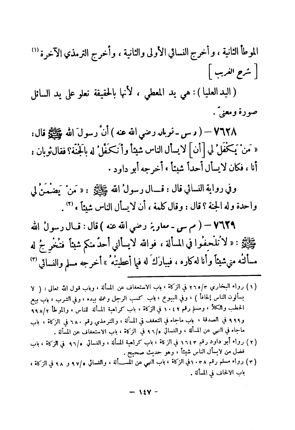 7628 - (د س) ثوبان - رضي الله عنه - أنَّ رسولَ الله - صلى الله عليه وسلم- قال «مَنْ يَكْفُلُ لي [أن] لا يسأل الناس شيئاً وأتَكَفَّلُ له بالجنّة؟ فقال ثوبان: أنا، فكان لا يسأل أحداً شيئاً» أخرجه أبو داود.