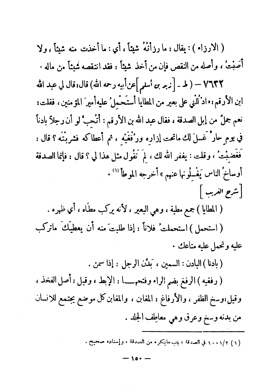 7632 - (ط) [زيد بن أسلم] عن أبيه - رحمه الله - قال: قال لي عبد الله بن الأرقم: «ادلُلْني على بعير من المطايا أستَحْمِلُ عليه أميرَ المؤمنين، فقلت: نعم جملٌ من إبل الصدقة، فقال عبد الله بن الأرقم: أتُحِبُّ لو أن رجلاً بادناً في يومٍ حارٍّ غَسلَ لك ما تحت إزارِه ورُفْغَيْهِ، ثم أعطاكه فشربْتَه؟ قال: فَغَضِبْتُ، وقلت: يغفر الله لك، لِمَ تَقُول مثل هذا لي؟ قال: فإنما الصدقة أوساخُ الناس يَغْسِلُونها عنهم» أخرجه الموطأ (¬1) .