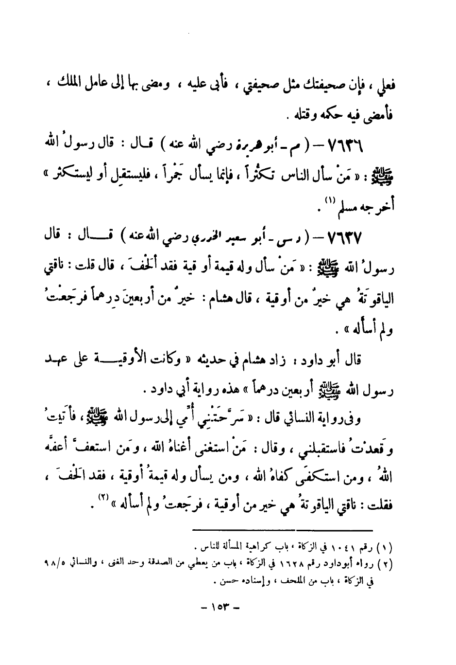 7637 - (د س) أبو سعيد الخدري - رضي الله عنه - قال: قال رسولُ الله - صلى الله عليه وسلم-: «مَنْ سأل وله قيمة أوقية فقد ألحفَ، قال قلت: ناقتي الياقوَتةُ هي خيرٌ من أوقية، قال هشام: خيرٌ من أربعينَ دِرهماً فرجَعْتُ ولم أسأله» .